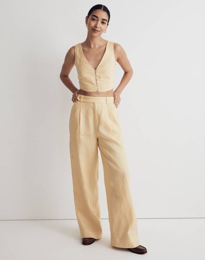 Coming in breezy 100 percent linen, our best-selling pants have wide legs and an extended sailor-inspired button tab at the waist.Full-length inseam that hits right above the ground when worn with heels.12 1/4" rise, 23" leg opening, 30" inseam. Petite inseam: 27 1/2"; tall inseam: 33".Linen.Machine wash.Imported.