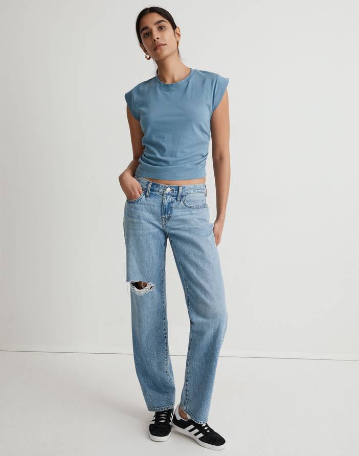 The cut: we reworked our best-selling slouchy straight-legged jeans with a Y2K-inspired hip-hugging low rise.The fabric: old-school 100 percent cotton denim with zero stretch.Vintage light wash with natural fading and distressing.8 3/4" low rise, 16" leg opening, 31" inseam.100% cotton (5% of which is recycled).Machine wash.Import.Madewell.com only.