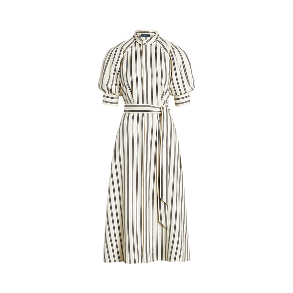 Dieses Hemdkleid wird aus glatter, fließender Maulbeerseide gefertigt und präsentiert sich in einer A-Linien-Silhouette mit vertikalen Streifen.