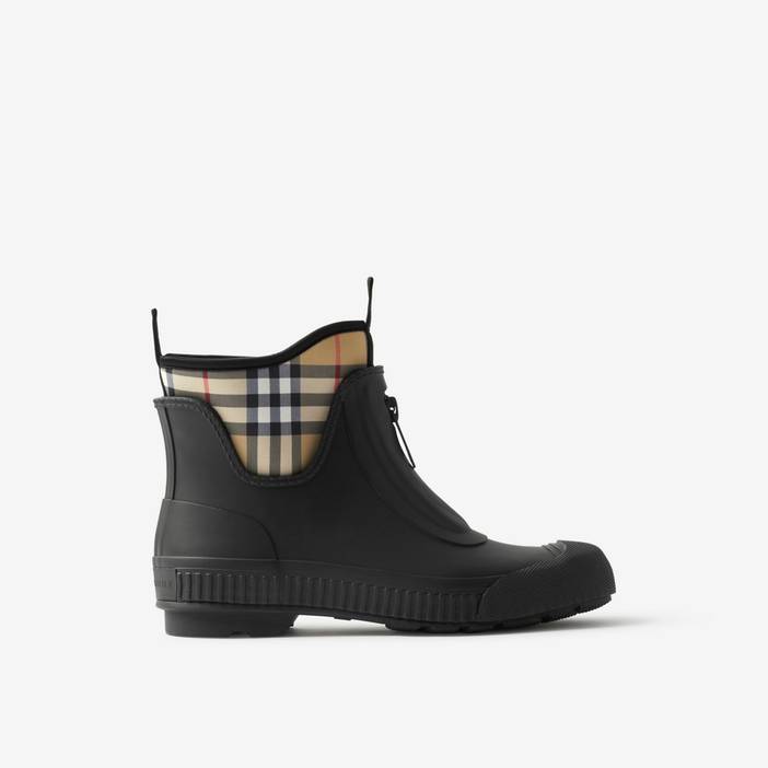 The rain boot reinterpreted with a removable Vintage check neoprene sock and a decorative front zip. Upper: 70% rubber, 30% polyester Lining: 100% polyester Sole: 100% rubber Heel: 100% rubber Slip-on style with pull tabs Printed Burberry lettering at heel Imported Burberry has created this product using high-quality natural rubber. To clean, wipe with a damp cloth or wash with lukewarm, soapy water. Do not use solvents Over time there may be a release of protective wax, leaving a fine white deposit. This is normal and does not affect the quality of the boots. To remove, please wipe boots with a damp cloth. Store out of direct sunlight in a cool, dry location away from extreme sources of heat or cold and avoid contact with dark or bright items.