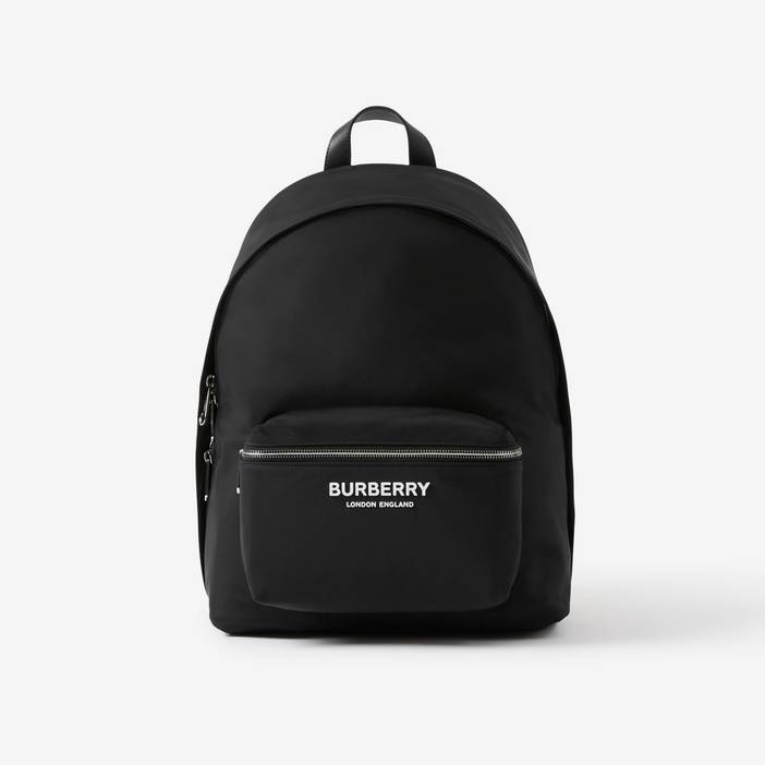 A classic silhouette highlighted with leather trims and a contrasting logo print. 30.5 x 14.5 x 42.5cm/12 x 5.7 x 16.7in Outer: 100% polyamide* Trim: 100% leather Back panel: 100% polyamide Lining: 100% polyamide Top handle, adjustable shoulder straps Two exterior zip pockets, one interior zip pocket Laptop compartment Two-way zip closure Polished metal hardware Quilted back panel Printed Burberry lettering at front Imported *ECONYL - a sustainable nylon yarn made from regenerated fishing nets, fabric scraps and industrial plastic.