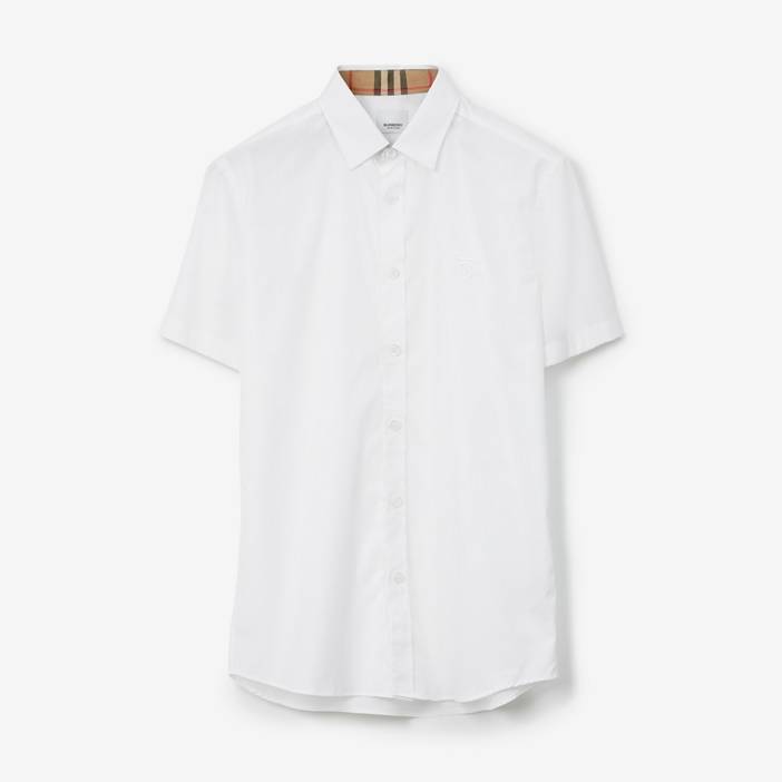 A short-sleeved shirt in stretch cotton poplin, cut for a slim fit and embroidered with our Thomas Burberry Monogram. Slim fit. This style is cut to a fitted silhouette. Shirt length: 77cm/30.3in. This is based on a size UK M. Model's height: 190cm/6ft 3in. Model wears size UK M. 97% cotton, 3% elastane Buttons: mother-of-pearl Short sleeves Point collar Curved hem Machine wash Imported