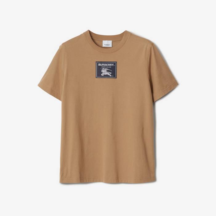 A classic cotton T-shirt cut to a regular fit. The design features an appliquéd patch highlighted with our logo and the Equestrian Knight Design - inspired by labels found in archive Burberry pieces. The rider's banner reads 'Prorsum', a Latin term which translates to 'forwards'. Regular fit. This style runs true to size, take your normal size. T-shirt length: 65.5cm/25.8in. This is based on a size UK S. Model's height: 177cm/5ft 10in. Model wears size UK S. 100% cotton Trim: 98% cotton 2% elastane Machine wash Imported