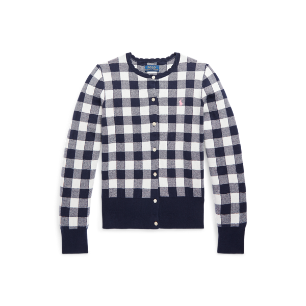 Ein übergroßes Gingan-Motiv und ungleiche Knöpfe verleihen dieser Strickjacke aus leichter, gekämmter Baumwolle einen charmanten Touch.