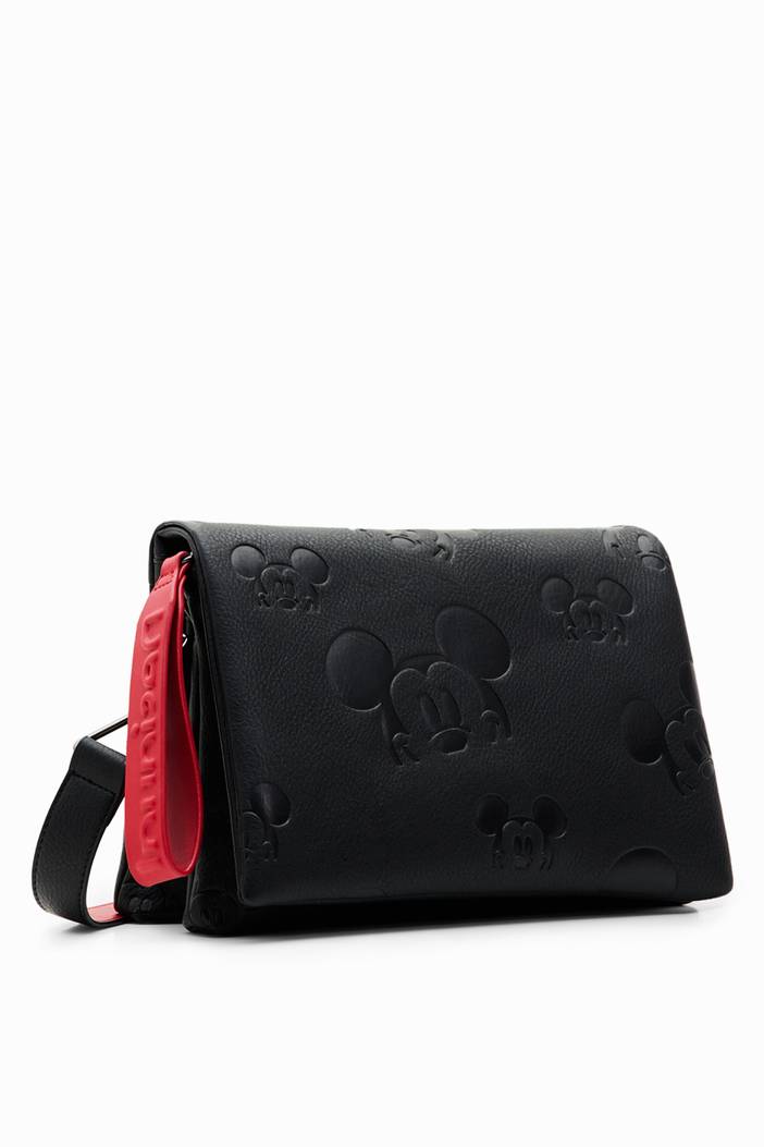 A midsize crossbody bag with a flap and multiple compartments and pockets. Featuring leather-effect fabric embossed with Disney's Mickey Mouse.