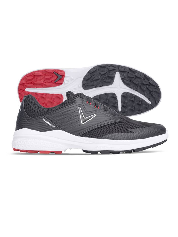 A smart choice for any weather conditions, the Callaway Solana SL v2 golf shoe features a durable upper crafted from performance mesh and microfiber leather and equipped with Opti-Dri™ waterproof protection. The Forged DX™ midsole and 5mm PLUSfoam insole provide soft and supportive cushioning underfoot, helping you stay comfortable during long rounds. An Opti-vent™ mesh liner helps to manage heat and moisture when you’re playing in warm and humid weather. The dura-rubber outsole has a sturdy, spikeless design that can be worn both indoors and out on the course, and it has multi-directional traction lugs to help you stay sure-footed on various surfaces. 60% Polyurethane / 40% Nylon Opti-Dri™ Waterproof Protection Waterproof Performance Mesh And Microfiber Leather Upper Forged Dx™ Midsole For Natural Ground Feel And Comfort Spikeless Dura-Rubber Outsole With Multi-Directional Traction Lugs 5Mm Plusfoam Insole For Comfort Opti-Vent™ Mesh Liner For Breathability And Heat Management Lace-Up Style Imported | Callaway Men's Solana SL V2 Golf Shoe, Black, Nylon/Polyurethane