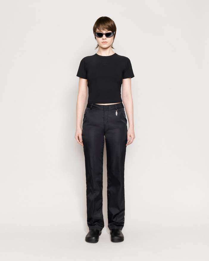 Chimi’s tailored nylon trousers is a straight silhouette with a form-fitting waist featuring pressed pleats, a Riri zip-fly, slanted side pockets and welt back pockets. Woven from a lustrous Italian recycled nylon that is water-resistant and windproof yet breathable. Finished with an embossed seasonal logo at the thigh and a detachable Chimi metal charm.