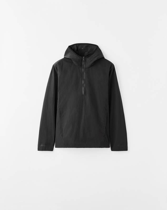 Chimi’s half-zip hoodie jacket is a relaxed fit made with a lightweight Italian recycled nylon with a shimmering, crinkled exterior that is water-resistant and windproof. Featuring a waterproof front zip, two side pockets and adjustable drawstrings for versatility. Finished with an embossed seasonal logo at the cuff and hood.