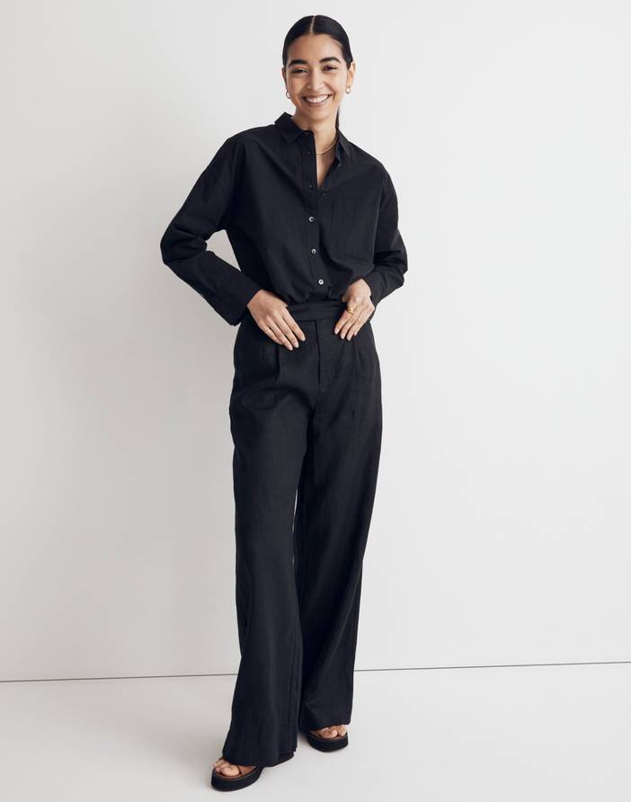 Coming in breezy 100 percent linen, our best-selling pants have wide legs and an extended sailor-inspired button tab at the waist.Full-length inseam that hits right above the ground when worn with heels.11 1/4" rise, 23" leg opening, 27 1/2" inseam. Regular inseam: 30"; tall inseam: 33".Linen.Machine wash.Imported.Madewell.com only.