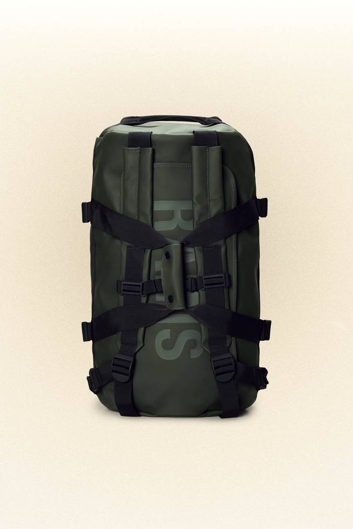 Texel Duffel Bag Small is a high-function silhouette designed for travelling. The bag is characterized by its tubular shape, large opening for easy packing and wrap-around webbing straps. Unzipping the main flap reveals a large main compartment with a side mesh pocket. The flap’s underside is also equipped with two zipped mesh pockets. Texel Duffel Bag Small features a concealed side pocket for passports, keys and other small essentials, a reinforced base for durability and stability, and side-mounted compression straps, helping to keep contents in place. Texel Duffel Bag Small can be carried in various ways via durable handle straps and adjustable padded backstraps. Texel Duffel Bag Small is cut in Rains’ signature waterproof PU fabric, engineered for carrying strength, durability, and a smooth feel.