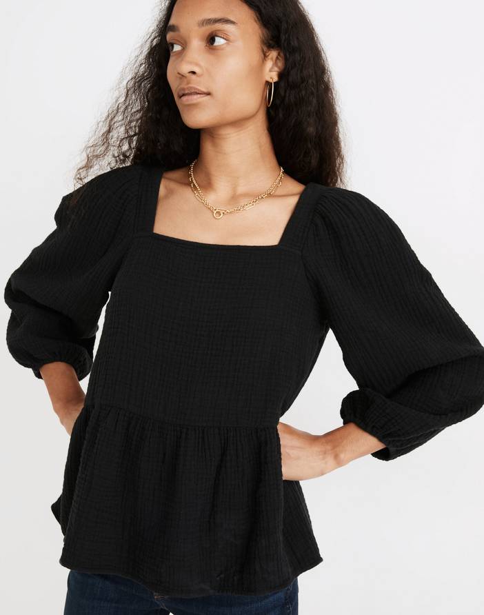 Made of our supersoft Lightspun double-gauze cotton, this easy-on-the-body peplum shirt has a square neckline and three-quarter puff sleeves. A breezy top for warm fall days. Regular fit.Body length from high point of shoulder: 25".Three-quarter sleeves.Cotton.Do Well: We partner with the Better Cotton Initiative to improve cotton farming globally.Machine wash.Import.Madewell.com only.