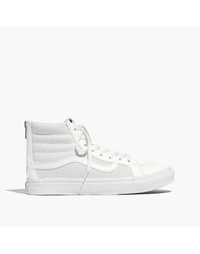 Synonymous with skateboarders, surfers and Southern California (where the brand was founded in 1966), Vans is a true sneaker icon. Cool meets casual with these zip-back high-tops in white perforated leather. When you select your size below, "H" equals a half size. Unisex sizing: Please size down 1 1/2 sizes; a size 4 1/2 is a women's size 6.Leather upper.Vulcanized waffle rubber sole.Import.Madewell.com only.