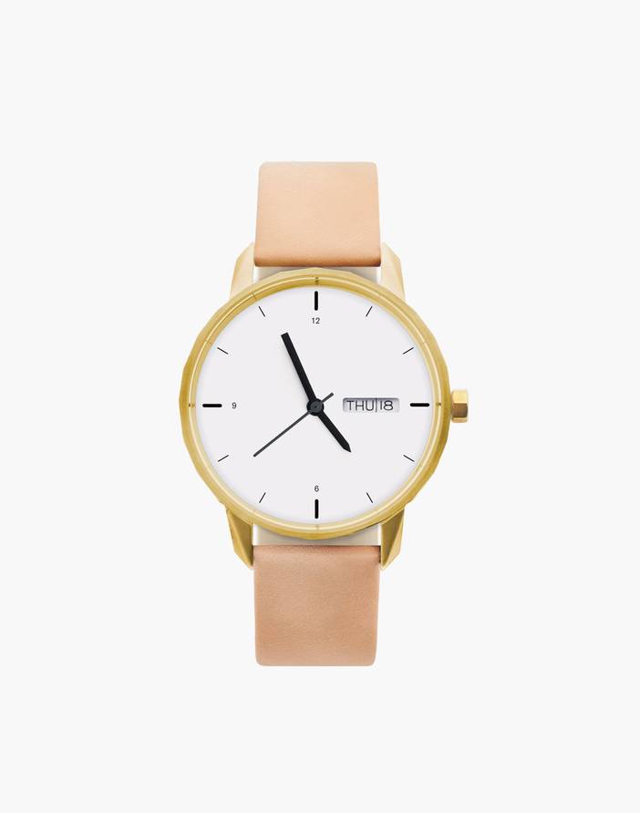 Based in Brooklyn, Tinker Watches crafts minimalist, go-with-everything timepieces using only the highest-quality materials. Shatterproof and scratch-resistant, this gold-toned design has everything you need to keep right on schedule: a precise Swiss Ronda movement and handy day/date window. Shop more Tinker styles. 316L stainless steel case.Swiss Rhonda movement.Italian leather strap.Sapphire crystal.Import.