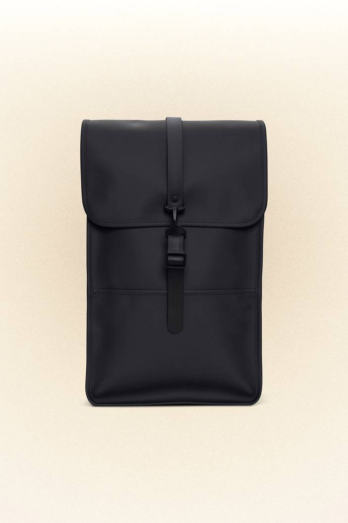 The Backpack silhouette is characterized by its prominent flap and central strap with carabiner closure. This clean and ever contemporary waterproof rucksack features an internal laptop pocket, a spacious main compartment, and a concealed external phone pocket on the back panel. Backpack is cut in Rains’ signature waterproof PU fabric, engineered for carrying strength, durability, and a smooth feel.