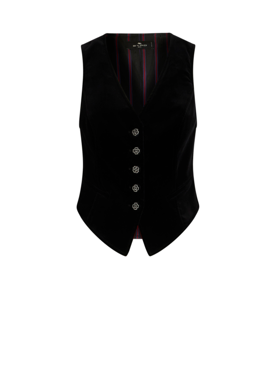 Weste aus Baumwollsamt, veredelt mit Knöpfen mit floralen Stickereien und einem charakteristischen Innenfutter mit Streifen.