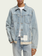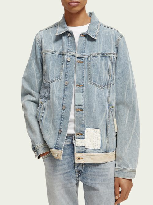 Part of our Eternal Blauw denim series, our unisex trucker jacket is washed in our Eternal Light tone. Made from an exclusive fabric that combines organic cotton with 20% pre-consumer recycled cotton from textile waste, this trucker jacket features unique details, including removable shank buttons, a contrast hem and repair accents.