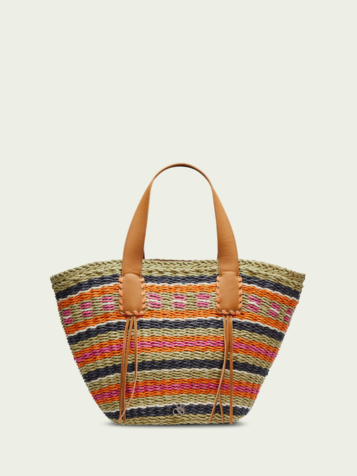Onze rieten tote bag is het ultieme functionele accessoire dat stijl en utility moeiteloos in balans brengt. Deze tas is speels versierd met een veelkleurig gestreept motief en we hebben er leren hengsels met gevlochten details aan toegevoegd voor een verrassende twist waar we weg van zijn.