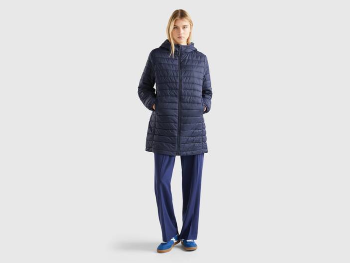 Leichte, gesteppte Jacke mit Kapuze aus Rain Defender"-Nylon mit Profilen aus Lycra. Gerade Passform und Länge, die bis zum Knie reicht. Öffnung vorne mit Reißverschluss, in die Seitennähte eingearbeitete Taschen mit Druckknopf. Warme und gleichzeitig leichte Wattierung aus recycelter Watte, die aus PET-Plastikflaschen hergestellt wird. Perfekt für die ersten kalten Tage."