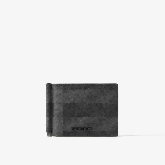 A Burberry Check wallet with a money clip for securing notes. 11 x 8.5cm/4.3 x 3.3in Outer: 70% thermoplastic polyurethane, 30% cotton Inner: 100% calf leather Lining: 100% viscose Six card slots Two slip pockets Hand-painted edges Polished metal hardware Raised Burberry lettering at front Imported