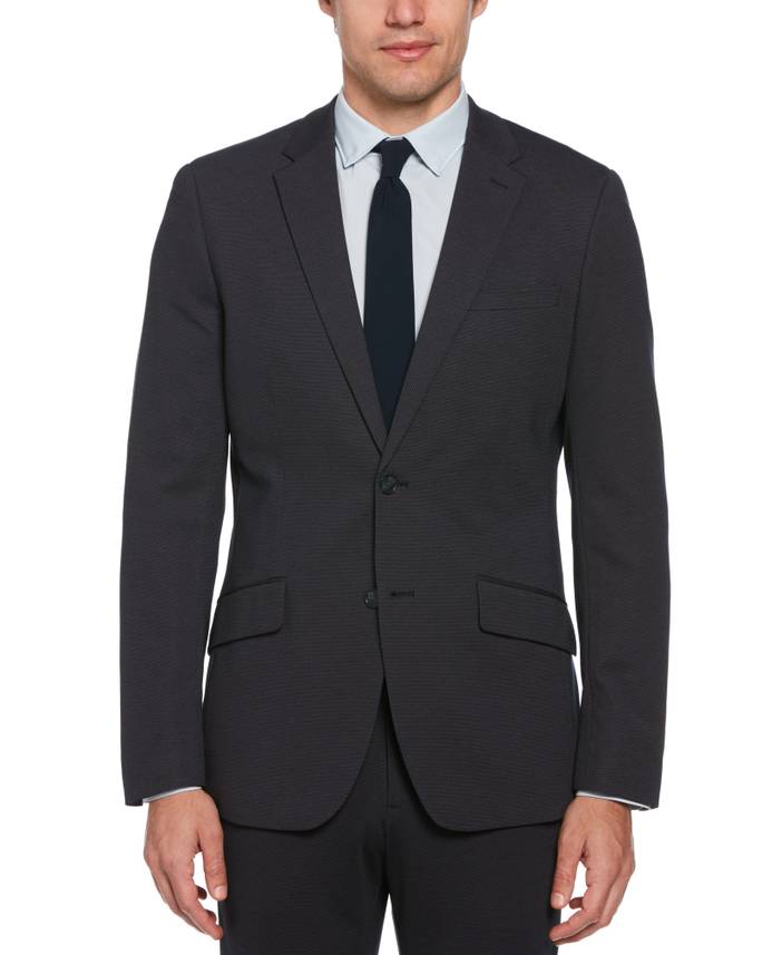 Elevate any outfit by adding this slim-fit suit jacket from Perry Ellis. With its sleek silhouette, versatile pin dot print and textured four-way stretch fabric, this sport coat will quickly become a go-to layering piece. A left chest pocket and front flap pockets offer convenient storage space for small essentials. 43% Nylon / 29% Viscose / 20% Polyester / 8% Elastane Slim Fit Pique Fabrication Incorporates Texture By Weaving In Raised Parallel Cords Into The Garment 4 Way Stretch Knit Fabric Single Back Vent Chest Pocket 2 Flap Pockets Dry Clean Only Imported Pair with Slim Fit Flat Front Stretch Knit Suit Pants Model Measurements: Height: 6'1" Waist: 32" Wearing Size40 Reg | Perry Ellis Men's Slim Fit Pindot Stretch Knit Suit Jacket in Dark Sapphire/Blue, Size 48 | Regular, Polyester/Nylon/Elastane