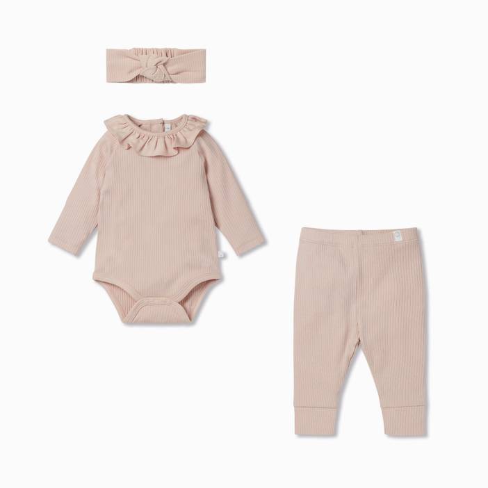 Comfortable and soft, the Ribbed Frill Set is perfect for little ones who love to move around in style. The set is made from the softest stretch fabric which is breathable and gentle on baby's skin. Bodysuit features: • Made from 67% bamboo, 28% organic cotton and 5% elastane