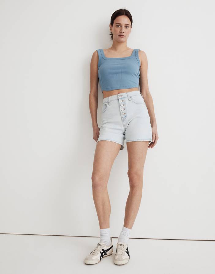 The cut: complete with the holds-you-in sorcery of our Magic Pockets™ in front, these vintage-y mid-length jean shorts have a superhigh fitted waist, a booty-accentuating shape, an exposed button fly, clean hems and side-seam slits.The fabric: vintage-y structured denim with a touch of stretch for a broken-in feel.Icy light indigo wash with natural fading.Front rise: 10 1/2; inseam: 5".99% cotton/1% elastane.Do Well: By buying cotton products from Madewell, you're supporting our investment in Better Cotton's mission to help cotton communities survive and thrive while protecting and restoring the environment. This product is sourced through a system of mass balance and therefore may not contain Better Cotton.Machine wash.Import.