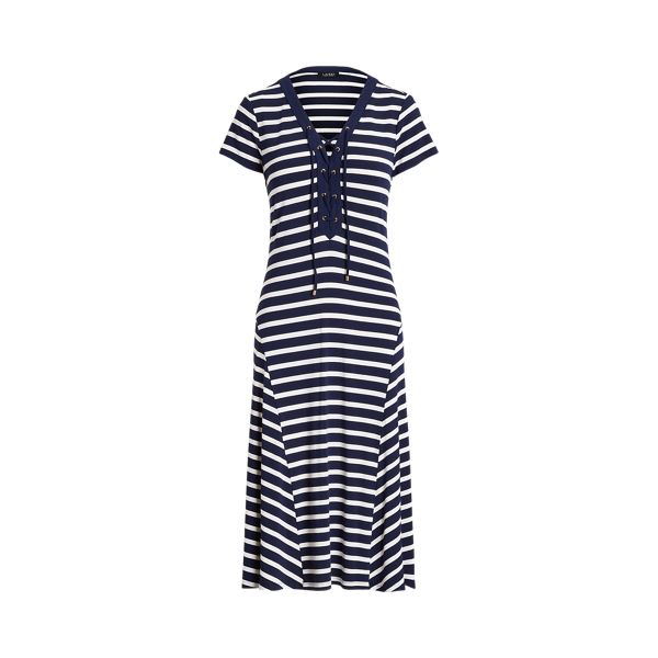 Dieses lässige Kleid wird für einen weichen Griff aus Jersey gefertigt und zeichnet sich durch zeitlose Streifen und eine Viertelleiste mit Schnürung aus.
