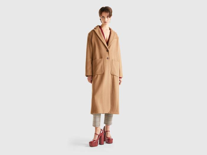 Benetton, Midi-mantel Aus Gemischter Shetlandwolle, größe 40, Camel, female