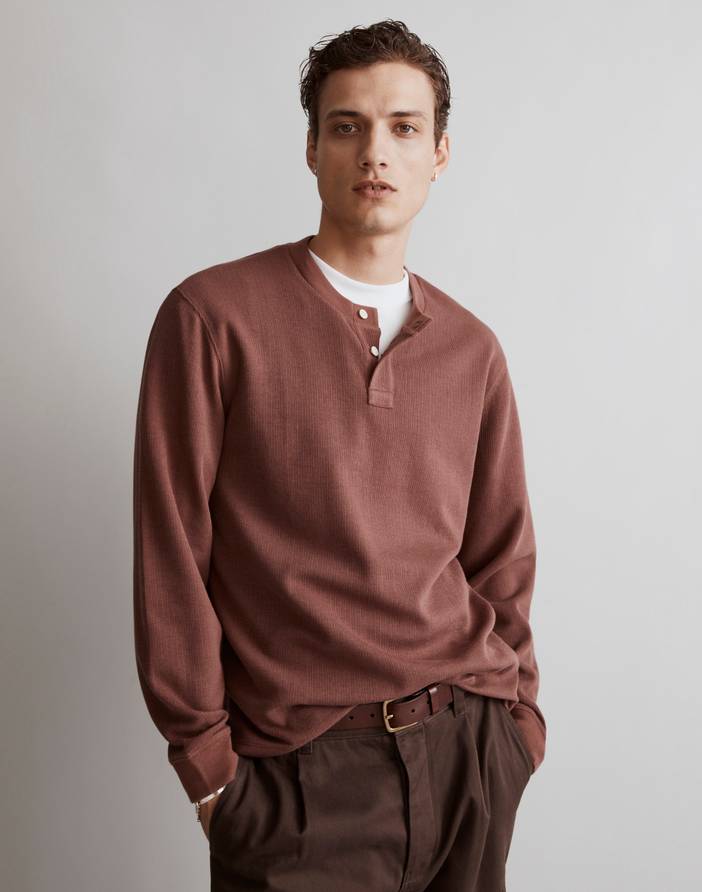 Coming in a cotton-blend textured jersey, this long-sleeve henley tee has a classic two-button placket. Layer it under your best flannel for some added warmth or on its own on cooler days.Regular fit.Body length: 28 3/4".Polyester/cotton.Machine wash.Imported.
