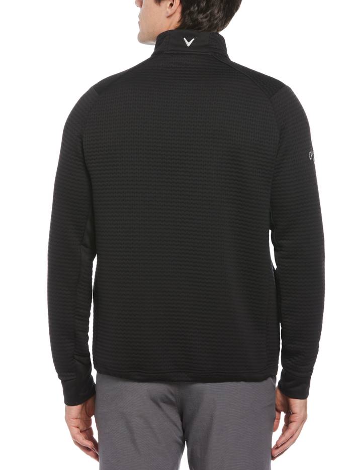 Experience superior comfort on and off the golf course with this Callaway men's long sleeve golf top. Featuring durable double knit fabrication and thermal technology, this half zip golf shirt from the Weather Series™ will help you stay warm and focused as you play season after season. Opti-Dri™ technology wicks away moisture, helping to keep you feeling dry. Covered with a stylish broken stripe pattern and equipped with a zippered chest pocket for storage, this base layer golf top will quickly become a staple of your athletic attire. 100% Polyester Double knit fabrication joins together two layers of fabric for extra thickness Weather Series™ Thermal Fabric For Warmth Opti-Dri™ Transfers Moisture Away From The Body To Keep You Cool And Dry Machine Washable For Easy Care Mock Neck Half Zip Closure Broken Stripe Print For Eye-Catching Style Zippered Chest Pocket Long Sleeves With Contrast Solid-Colored Panels Machine Wash Imported | Callaway Men's Textured Midweight Stripe Half Zip Pullover Golf Shirt, Black, 100% Polyester