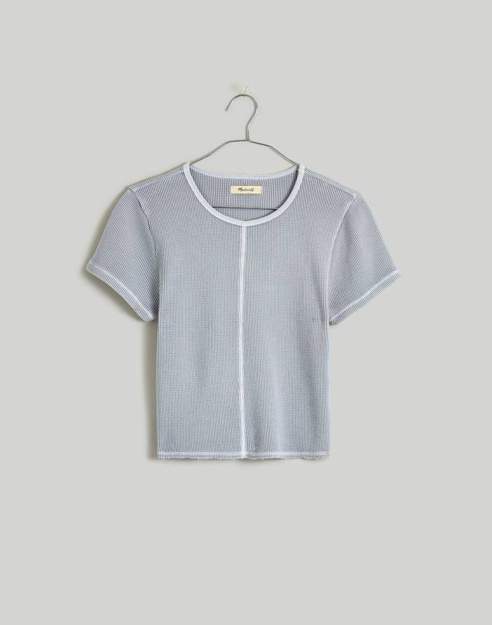 Made of airy, supersoft waffle knit, this cropped crewneck baby tee is garment-dyed for dimensional color with cool topstitching details.Regular fit.Crop length: designed to hit low on the ribcage and show a hint of skin.Body length from high point of shoulder: 19 1/8".Cotton.Do Well: By buying cotton products from Madewell, you're supporting our investment in Better Cotton's mission to help cotton communities survive and thrive while protecting and restoring the environment. This product is sourced through a system of mass balance and therefore may not contain Better Cotton.Machine wash.Imported.