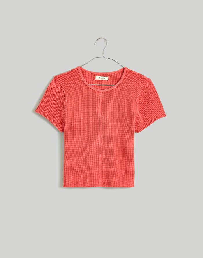 Made of airy, supersoft waffle knit, this cropped crewneck baby tee is garment-dyed for dimensional color with cool topstitching details.Regular fit.Length: designed to hit between the bellybutton and high hip.Body length from high point of shoulder: 23".Cotton.Machine wash.Imported.Madewell.com only.