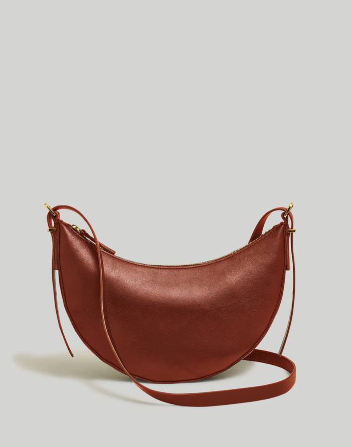 Our leather bag and accessory collection is cool, modern and quietly luxe. With a zip closure, this half-moon-shaped mini bag is perfectly sized to hold your phone, card case, keys and lipgloss (AKA it's great for doing that day-to-night thing). Plus, it's a two-for-one: The detachable top handle can be replaced with the adjustable crossbody strap. It's so good, it's Essential.Leather.Zip closure.Interior pocket.6 2/3" handle drop.5 2/3"H x 11"W x 1 1/4"D.Imported.Select stores.