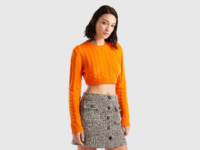 Benetton, Cropped Pullover Mit Zopfmustern, größe L, Orange, female