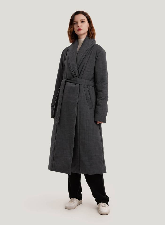 This padded coat is your warm option of outwear when temperatures begin to drop. It is shaped like an oversized wraparound silhouette with no-quilting and filled with a wool blend. This cloud feels soft coat will trap body heat and keeping your temperature with irresistible comfort. – Shell: 50% Wool 46% Polyester 4% Spandex Filling: 100% Polyester