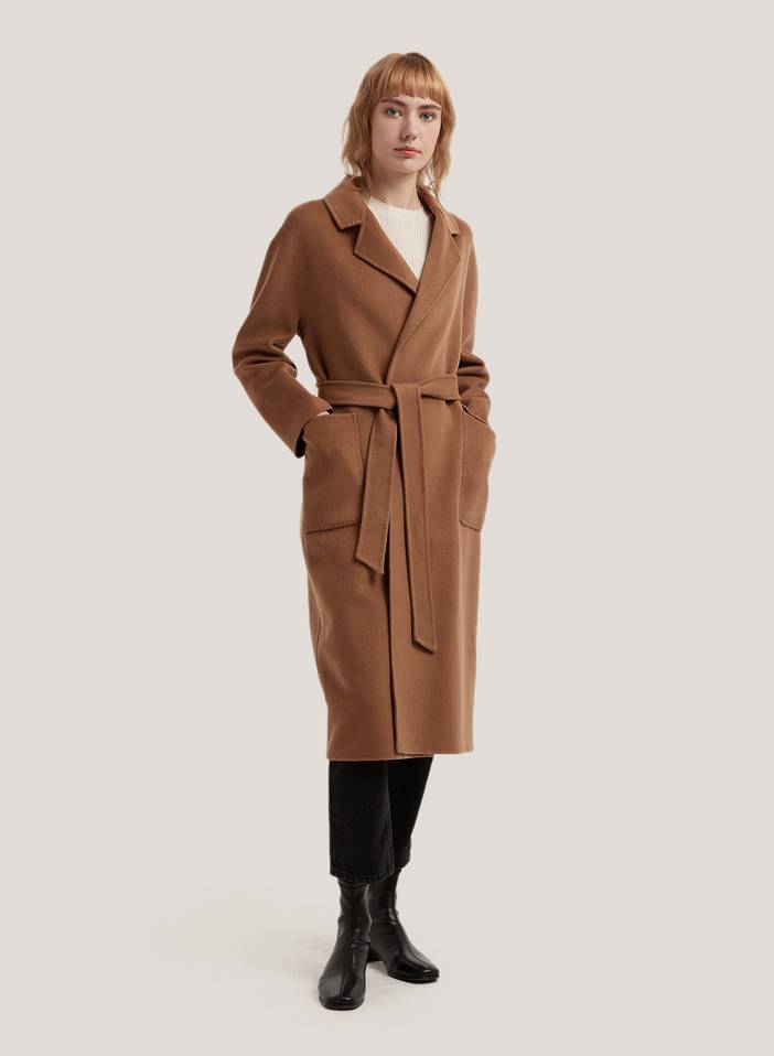 Belted Waist 100% Wool Long Coat Camel S