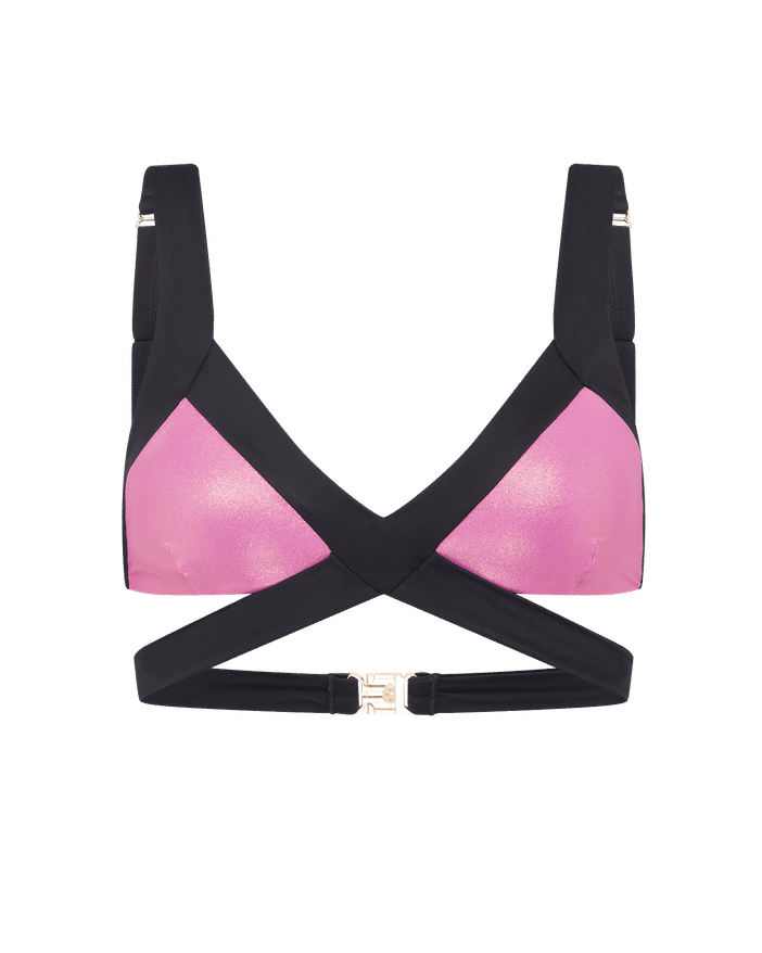 Meet Mazzy: the original iconic, best-selling swimsuit. Discover Mazzy's famously flattering fit - a must for any beach goddess. Bandage-style straps wrap around your body to dramatic effect. Guaranteed to turn heads at the poolside - it's no wonder she's a best-seller every season. Black, pink, and cobalt bikini top Coloured panels have a gold foiled shimmer finish to catch the light Our bestselling swimwear line Italian sustainable ECONYL® techno-fabric Soft triangle cups Flattering bandage-style wraparound effect Plating on sliders and clasp contains real gold Dramatic cut-outs over the ribs Team with the matching Mazzy bikini bottoms for a truly scintillating look