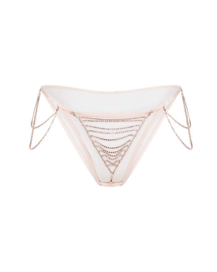 An ode to showgirls, Jasmira reveals your alter-ego. Pink brief Crafted from rose gold detachable chains with multicolour encrusted crystals Sand sheer tulle bound with pink silk satin Pair with the matching Jasmira bra and suspenders