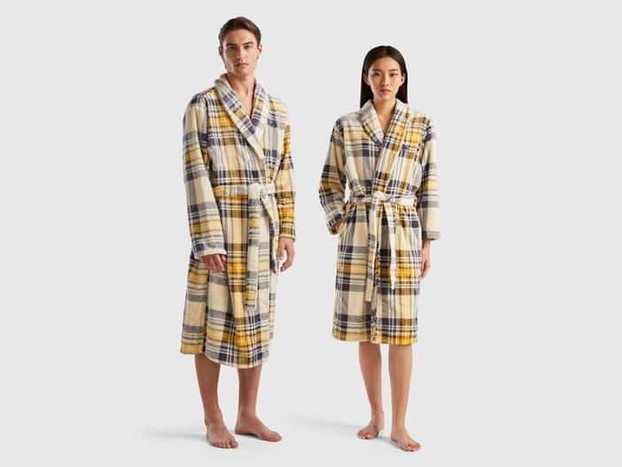 Hausmantel aus warmem und weichem Kunstfell mit Teddybär-Effekt und mehrfarbigem Schottenkaromuster. Ausgestattet mit einem Taillengürtel, Logo auf der Herzseite und Taschen an den Hüften.