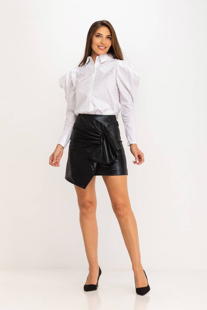 Nuestra Falda Drapeada Mini Negro te hará destacar con estilo y elegancia. Confeccionada con una silueta de tiro medio, esta prenda presenta una sobrefalda con volante que añade un toque coqueto y sofisticado. Luce un look chic y femenino con esta falda que combina moda y comodidad en un solo conjunto.