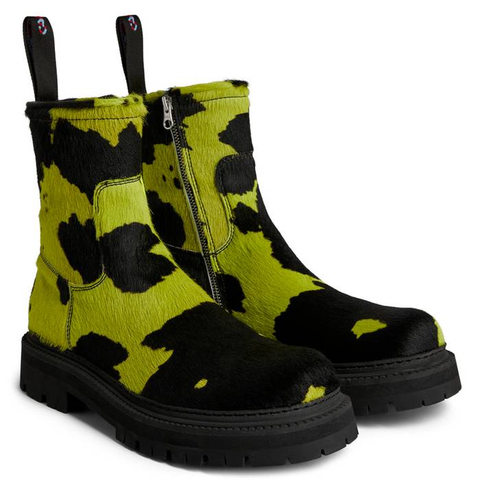 Camper Calf hair boots with cow pattern and chunky outsoles. Upper Calfskin (Leather Working Group Certified) Color Multicolor Outsole/Features 100% Rubber Side zip Insole OrthoLite® Recycled™ for cushioning Lining 73% calfskin 27% recycled polyester