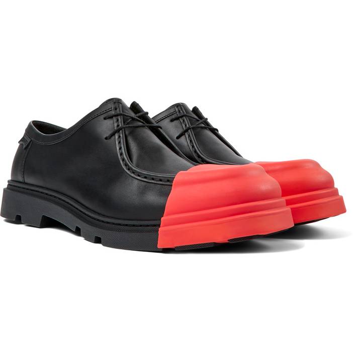 Camper Black leather men's shoes with removable toe caps, OrthoLite® Recycled™ removable footbeds, and rubber outsoles (40% natural, 23% recycled). Made with minimal components and glue, Junction is easy to disassemble promoting a more circular approach to shoe-making. Upper Calfskin / Synthetic Color Black Outsole/Features 40% natural rubber / 37% rubber / 23% recycled rubber Insole OrthoLite® for cushioning Lining 61% textile (45% recycled polyester - 35% recycled cotton - 20% viscose) 26% recycled polyester 13% nubuck