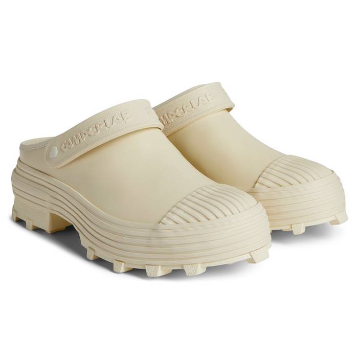 Camper Vulcanized white leather clogs with slingback straps and toothed rubber outsoles. Upper Calfskin (Leather Working Group Certified) Color White Outsole/Features 100% Rubber Insole OrthoLite® Recycled™ for cushioning Lining 69% textile (45% recycled polyester 35% recycled cotton 20% viscose) 31% calfskin