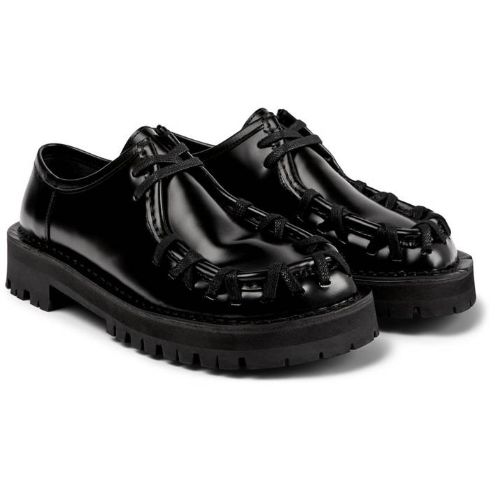 Camper Black leather shoes with visible black stitching and chunky rubber outsoles. Upper Calfskin (Leather Working Group Certified) Color Black Outsole/Features Rubber / EVA Insole OrthoLite® for cushioning Lining 43% calfskin 32% recycled polyester 25% textile (55% PU - 45% recycled polyester)
