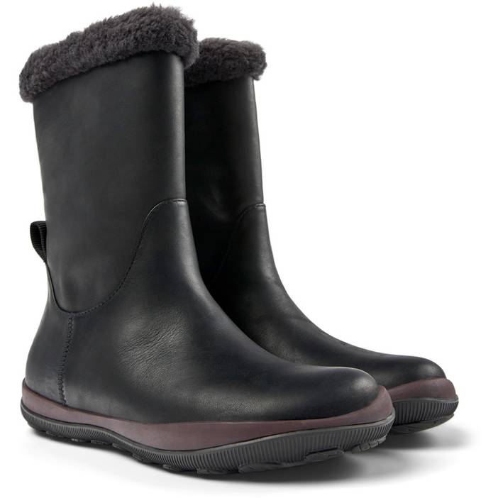 Camper Black leather women's boots with GORE-TEX technology, recycled PET fur, OrthoLite® Recycled™ footbeds, EVA midsoles, and Michelin rubber outsoles (27% natural). Meet Peu Pista, the most advanced performance style in our iconic Peu family, an all-weather design with Michelin outsoles and cushioned footbeds. Your winter solution. Upper Calfskin (Leather Working Group Certified) Color Black Outsole/Features 45% rubber / 17% natural rubber / 38% EVA Michelin outsole: Superior grip and durability GORE-TEX: complete waterproof protection and optimum climate comfort. Insole OrthoLite® for cushioning Lining 44% Textile (80% Wool, 20% TENCEL® Lyocell), 42% Polyester, 14% recycled Polyester