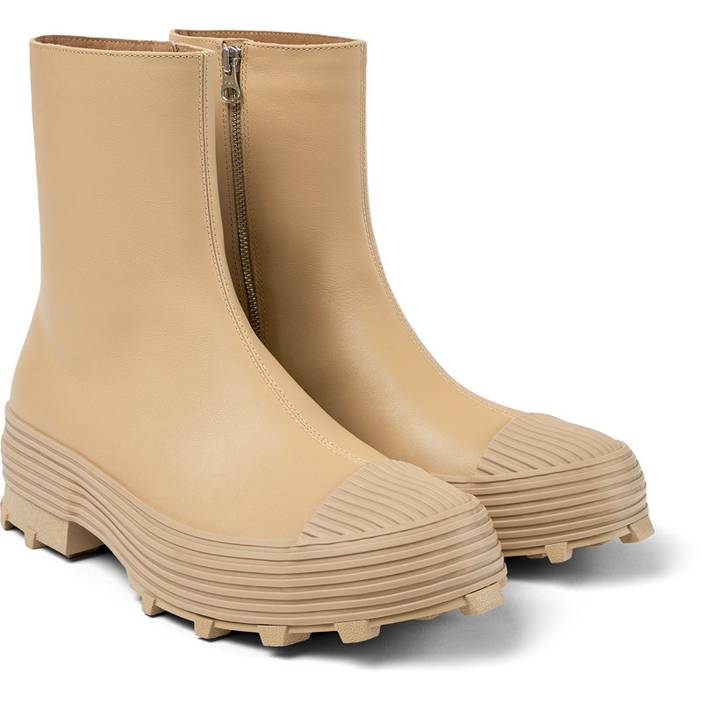 Camper Beige vulcanized leather zip boots with toothed rubber outsoles and OrthoLite® cushioned footbeds. Upper Calfskin / Rubber Color Beige Outsole/Features 100% Rubber Side zip Insole OrthoLite® for cushioning Lining 64% textile (45% recycled polyester - 35% recycled cotton - 20% viscose) 19% calfskin 17% recycled polyester