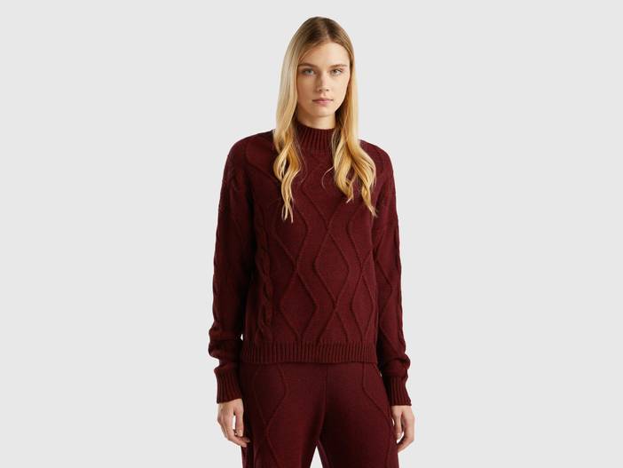 Benetton, Rollkragenpullover Mit Zopf- Und Rautenmuster, größe M, Bordeaux, female
