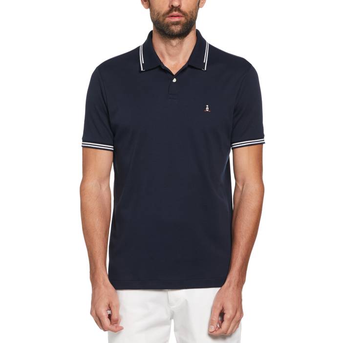 Get the perfect combination of style and comfort with this Original Penguin polo shirt. This slim fit, short-sleeved polo is crafted from 100% organic cotton to provide breathable comfort that's just right for all-day wear. Interlock fabrication ensures a natural stretch for a comfortable and flattering fit. As a versatile wardrobe staple, this men's polo is perfect for casual outings and can also be dressed up for special occasions, work events and more. Fashionable and functional, this polo shirt for men is a great way to step-up your style game with a timeless look. 100% Organic Cotton Slim Fit Interlock Knit Fabrication Incorporates Close Stitching To Create Added Stretch Polo Collar Two-Button Placket Contrast Stripes For Versatile Casual Style Tv Pete Logo On Left Chest Short Sleeve Machine Wash Imported Model Measurements: Height 6'2â Waist 32" Modeled in size M | Original Penguin Men's Organic Interlock Tipped TV Pete Polo Short Sleeve in Dark Sapphire Blue, Size XS, 100% Cotton | Munsingwear
