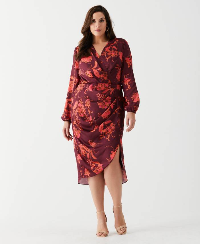 Crafted from sleek satin fabric with a floral print, this Ella Rafaella midi wrap dress offers elegant style for the modern woman. The above - the - knee length and V - neck offer a flattering silhouette while the faux wrap waist and front pleats add a sophisticated touch that's just right for the office or a night on the town. This floral midi dress also features elastic sleeve openings, an encased elastic at the back waist and an invisible zipper on the side for a flawless fit while the full lining provides comfortable wear. Stylish and comfortable, this midi dress is a fashionable choice for any occasion. 100% Polyester Satin Has High Luster And A Smooth Drape Washer Satin Fabric Flattering Modern Fit Proportional Plus Size Design With A Comfortable Classic Fit V - Neck Elasticized Cuffs Front Pleats Faux Wrap Waist Encased Elastic At Back Waist For A Customized Fit Invisible Side Zipper Fully Lined All - Over Floral Print For Eye - Catching Style Long Sleeves 36.5" Above Knee Midi Length Hand Wash Imported | Ella by Rafaella Women's Plus Size Faux Wrap Midi Dress in Windsor Wine Purple, Size 1X, Floral, 100% Polyester