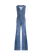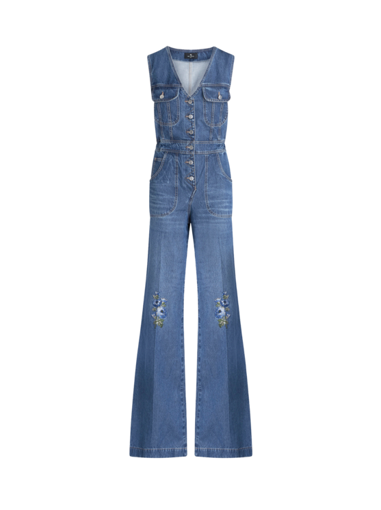 Ärmelloses Jumpsuit aus Denim mit V-Ausschnitt und ausgestellter Hose, verziert mit mehrfarbigen floralen Stickereien.